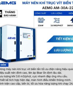 Khi phân xưởng của bạn bước vào giai đoạn tăng tốc sản xuất, một nguồn cấp khí nén dồi dào và ổn định là yếu tố mang tính quyết định. Với lưu lượng lên tới 3.6 m³/phút, máy nén khí trục vít biến tần AEMG AM-30A (công suất 22kW) chính là thiết bị “nòng cốt” hoàn hảo. Cỗ máy 30HP này không chỉ đáp ứng xuất sắc nhu cầu dùng khí liên tục mà còn giải quyết triệt để bài toán chi phí vận hành nhờ công nghệ biến tần thông minh.