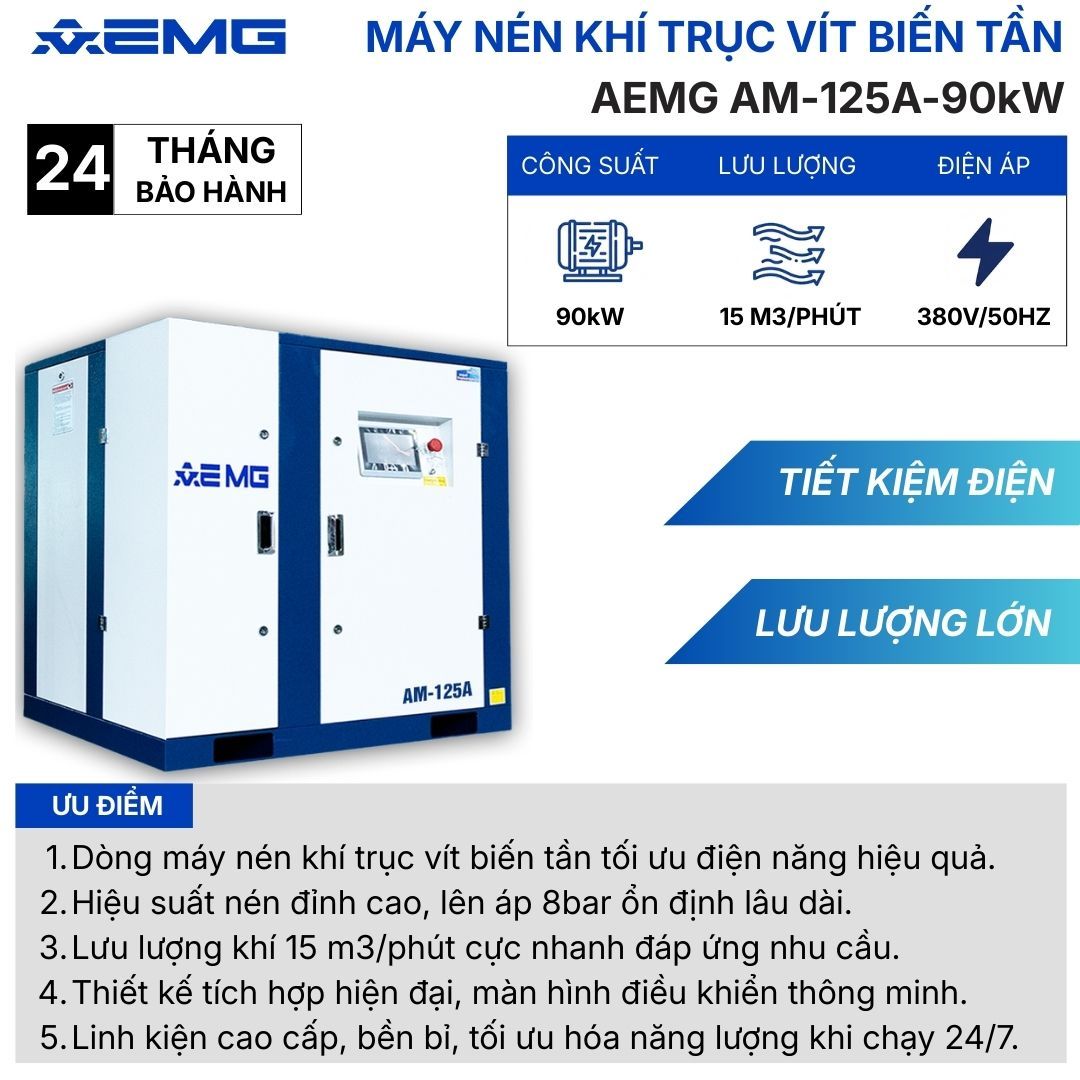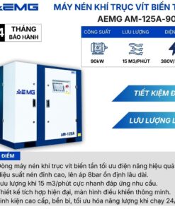 Khi quy mô nhà máy liên tục được mở rộng, một hệ thống nén khí công suất lớn là yêu cầu bắt buộc để duy trì nhịp độ sản xuất. Tuy nhiên, đi kèm với sức mạnh đó luôn là nỗi lo về hóa đơn tiền điện và sự sụt áp lưới điện mỗi lần khởi động. Máy nén khí trục vít biến tần AEMG AM-125A (công suất 90kW) ra đời để giải quyết trọn vẹn bài toán đó, mang đến 15 khối khí mỗi phút cùng công nghệ Inverter tiết kiệm năng lượng.